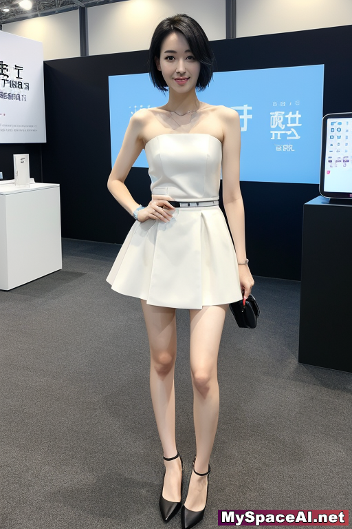 Japan, Technology Expo, Tech Innovator, Modern smartwatch, Petite and slender build, Proportionate legs, Short black hair, Fair and porcelain skin, Neatly trimmed.